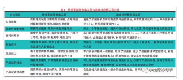 激光拼焊板在汽車產(chǎn)品上應(yīng)用后,有效提高了整車的各項性能,并且在降低制造成本方面具有顯著的優(yōu)勢。采用激光拼焊板與傳統(tǒng)零部件產(chǎn)品制造工藝對比,其優(yōu)勢,如表1 所示。