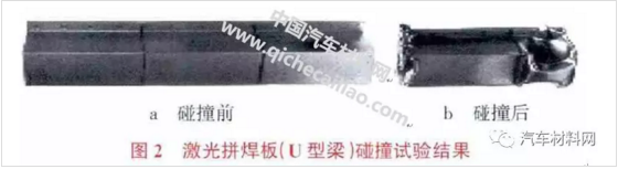 為驗證產(chǎn)品結(jié)構(gòu)性能,對由3 塊不同強度的鋼板沖壓成U 型梁的激光拼焊板進行碰撞試驗,如圖2 所示。要求發(fā)生碰撞時兩端潰縮吸能,中間保持原有形狀。從圖2 可以看出,碰撞后按照設(shè)計要求兩端潰縮吸收撞擊能量,中間基本無變形。