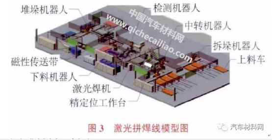 生產(chǎn)設(shè)備主要由三部分組成。1)傳輸裝置:包括上料車、拆垛機器人、中轉(zhuǎn)機器人、下料機器人、磁性傳送帶、打淺坑裝置及堆垛機器人;2)激光焊接設(shè)備:包括定位工作臺及激光焊機;3)檢測設(shè)備:包括在線無損檢測設(shè)備及檢測機器人。圖3 示出激光拼焊線模型圖。