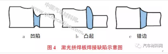 激光拼焊板焊接完成后易產(chǎn)生的質(zhì)量缺陷,如圖4所示。質(zhì)量控制標(biāo)準(zhǔn)為:上下凹陷深度不得超過薄板厚度的10%;上下凸起不能超過薄板厚度的20%;上下錯邊深度不得超過薄板厚度的10%。
