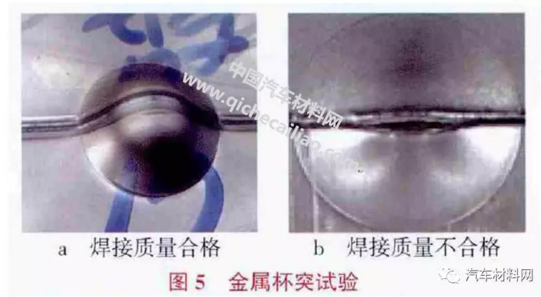 激光拼焊板質(zhì)量試驗檢驗方法采用金屬杯突試驗檢測,圖5 示出金屬杯突試驗后的檢測結(jié)果。