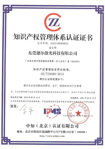近日獲悉,東莞德爾激光科技有限公司知識產(chǎn)權(quán)管理體系符合GB/T29490-2013標(biāo)準(zhǔn),其公司的激光全自動切割機(jī)的研發(fā)、生產(chǎn)、銷售的知