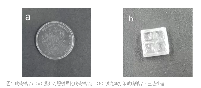筆者所在的課題組在國內較早開展了激光3D打印玻璃的研究和探索。通過分散機將平均粒徑為50 nm的氣相SiO2粉體分散在甲基丙烯酸羥乙酯(光敏單體)、四乙二醇二丙烯酸酯(交聯劑)和安息香二甲醚(光引發劑)的混合溶劑中,形成流動性良好的液態玻璃漿料,將玻璃漿料置于模具中用紫外燈照射使其固化,驗證了該漿料用于光固化立體成形的可行性。接著以該玻璃漿料為原料,利用光固化快速成型機,在激光功率70 mW,掃描速率2000 mm/s打印出塊狀坯體,通過后續熱處理排脂,最終在1250 ℃得到透明玻璃塊體,見下圖2。