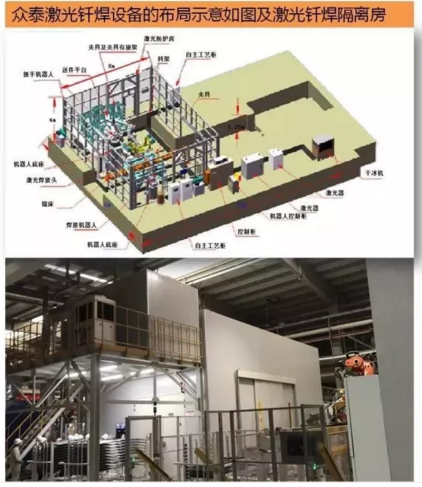 眾泰激光釬焊系統由主控PLC(主控可編程邏輯控制器)、激光焊接機器人、焊接頭、送絲機構、激光器、搬運機器人、激光房、工裝夾具等部分組成。