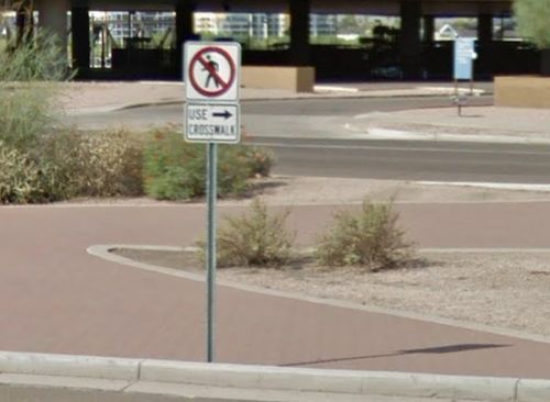 重點一:如前述,死者過馬路的位置是絕對禁止過馬路的地點。如下圖示,N Mill Ave 的雙方向兩條車道分隔開,中間是一個綠化區(qū)域,死者正是從這個綠化區(qū)域向東穿行: