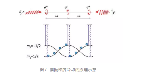 考慮原子的基態角動量Jg=1/2,存在2個磁子能級mg=±1/2,在冷卻激光的作用下,2個磁子能級產生光頻移,簡并消失。不同偏振狀態的光對2個磁子能級產生的光頻移不同,如圖7所示,σ+光造成mg (1/2)能級低于mg (-1/2),σ-光造成mg (-1/2)能級低于mg (1/2)。因此,原子的2個基態塞曼子能級在光頻移的作用下形成周期為λ/2的空間變化的能級結構。光抽運效應是指在σ+偏振狀態處,由躍遷選擇定則,只與mg (-1/2)能級的原子作用(考慮上能級的角動量Je=1/2),原子躍遷至上能級后通過自發輻射返回基態2個磁子能級。其中返回至mg(-1/2)的原子將被再次激發至上能級,而返回至mg (1/2)的原子則不再與σ+光作用。光抽運效應導致在σ+光偏振狀態處,原子被抽運在mg (1/2)能級。同理,在σ-光偏振狀態處,原子被抽運在mg (-1/2)能級。假定原子初始處于mg(1/2)能級(圖7),運動過程中在偏振光場的作用下原子的勢能上升,原子走過λ/4的距離到達σ-偏振狀態處。此時,σ-光將原子抽運至另一磁子能級mg(-1/2),再從這里開始重復“爬坡”的過程。根據能量守恒原理,原子在爬坡的過程中損失動能增加勢能,這種勢能的增加又通過自發輻射到最低能級放出較高能量光子而釋放。這樣,原子不斷消耗能量而減速、冷卻,稱為偏振梯度冷卻。
