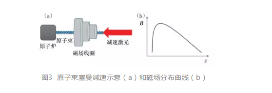 為提高原子束的減速效率,需要在減速過程中連續地補償多普勒頻移。采用的一種方案是連續掃描激光的頻率,使激光與原子躍遷頻率持續保持共振;另一種是保持激光的頻率不變,利用磁場對原子塞曼效應,改變原子的躍遷頻率,稱為塞曼減速。如圖3所示,采用磁場線圈可以實現強度隨空間變化的磁場,設計磁場分布曲線,使原子躍遷頻率的變化與多普勒頻移匹配,原子在行進過程中與激光持續作用,速度不斷降低,實現激光減速過程。