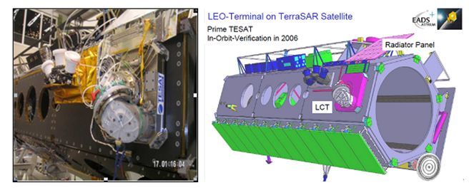 DLR資助的著名項目LCTSX于2002年11月啟動,其目的是通過GEO與GEO、GEO與LEO以及GEO與地面站之間的激光鏈路驗證自由空間相干通信的可靠性。用于星間激光通信的兩個終端LCTs(Laser CommunicationTerminal),分別于2007年4月23日搭載美國的LEO衛星NFIRE和2007年6月14日搭載德國的LEO衛星TerraSAR-X發射升空。隨后,在2008年2月21日成功進行了國際上首次星間相干激光通信實驗。