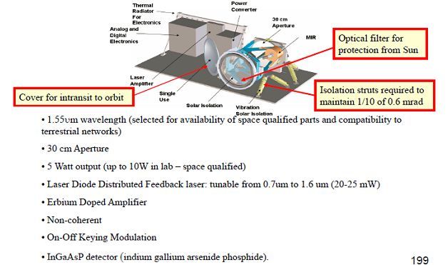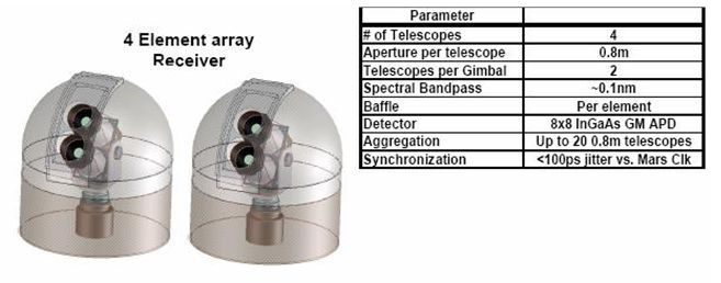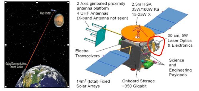 NASA于2003年開始執行火星激光通信驗證(MARS Laser CommunicationDemonstration,MLCD)項目,目的是提供深空光學鏈路的早期經驗。該項目由NASA/哥達德航天飛行中心(GSFC)管理,其星上子系統由麻省理工學院(MIT)林肯實驗室(LL)研制,而地面子系統則由JPL和MIT-LL共同研制。星上終端計劃在火星通信軌道器(MTO)上進行飛行試驗,該任務原定于2009年10月發射。MLCD項目于2004年10月成功完成了系統要求評審,又于2005年3-5月完成了星上終端與地面終端的初步設計評審。后來由于NASA內部的計劃變更,中止了MLCD項目。但是在MLCD項目進行期間,深空光學通信要求的定義和設計是非常先進的,該項目對于來自空間的波束穩定化和在地面上的有效光子計算與日間操作等各項關鍵技術都進行了開發。