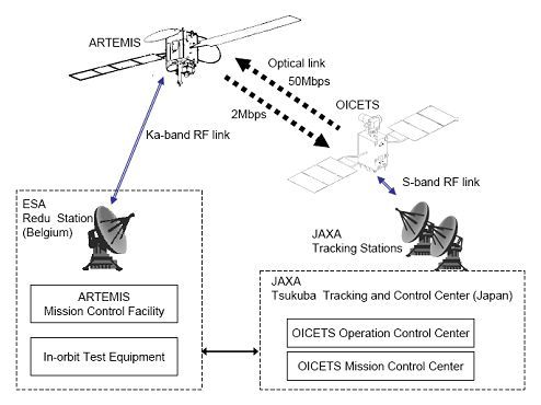 2005年末,ARTEMIS又同JAXA光學通信工程試驗衛星(Optical Inter-orbit Communication Engineering Test Satellite ,OICETS)成功進行了自由空間軌道間激光通信試驗。星上搭載了由日本NEC 東芝空間系統公司研制的通信終端“激光利用通信設備”(Laser UtilizingCommunications Equipment,LUCE)。