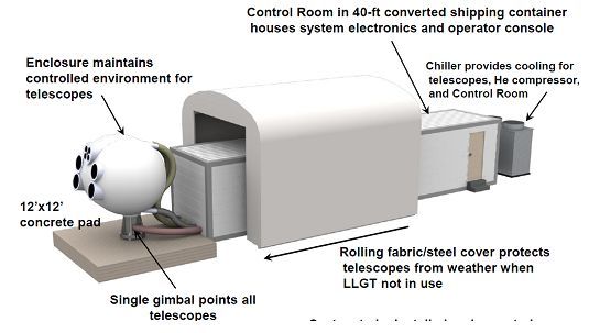 LLGT為LLCD的主要地面終端,這是一個移動型地面接收系統。具有溫控外殼,高約4.5m,總質量7t,與目前的無線電通信地面天線相比,尺寸和重量減少約75%。 LLCD 的目標之一是演示驗證多孔徑合成光信號收發技術。