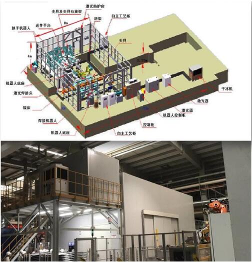 眾泰激光釬焊系統由主控PLC(主控可編程邏輯控制器)、激光焊接機器人、焊接頭、送絲機構、激光器、搬運機器人、激光房、工裝夾具等部分組成。是國內規模較大,體系較完整的激光釬焊系統。