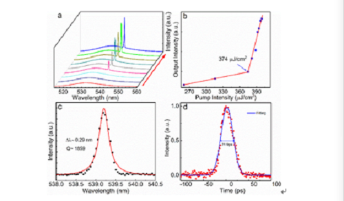 圖2 雙光子泵浦頻率上轉換立方體微腔激射。a)單模激光。b)激射閾值。c)光譜寬度。d)輸出時域脈沖。