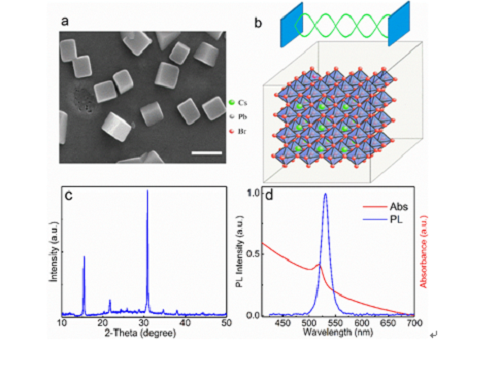 圖1 立方體鈣鈦礦光學性能表征。a)TEM形貌圖。b)晶體結構及微腔示意圖。c) XRD譜圖。d)吸收譜和熒光譜。