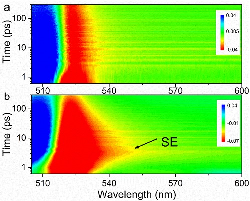 圖3 閾值上下瞬態吸收譜。a)閾值下。b)閾值上。