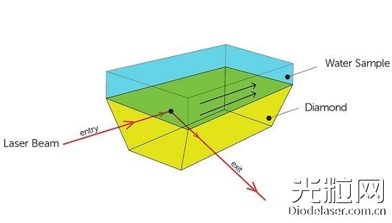 紅外光束被送入水流過的鉆石中。 然后,IR光在與水樣接觸的內表面上反射,然后由檢測器在離開晶體時收集。