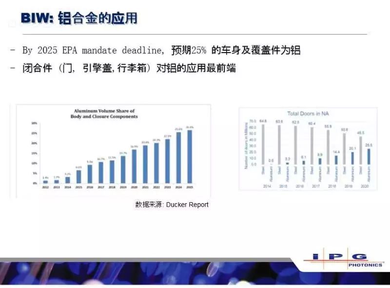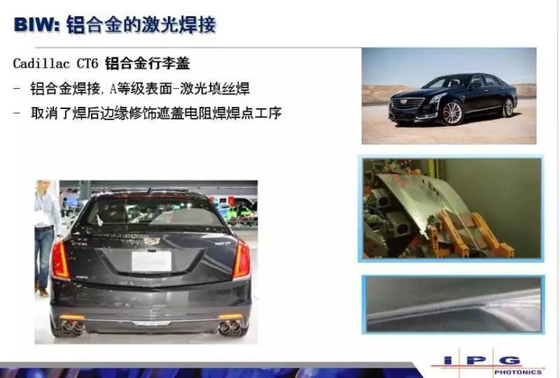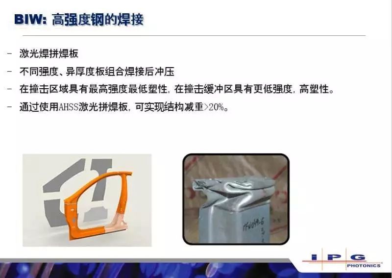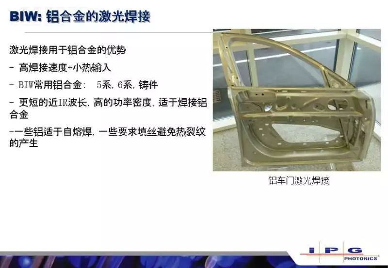 這里講師再次將話題切換到白車身,主要是想說說新能源車的話題,新能源車使用電池驅(qū)動(dòng),對(duì)于這個(gè)車輛的重量會(huì)比傳統(tǒng)的汽車會(huì)更加敏感,而且對(duì)于一些新材料的應(yīng)用會(huì)更加大刀闊斧,在國(guó)產(chǎn)新能源車的全鋁車身里,都是用的IPG的激光器做的全鋁車身的焊接。