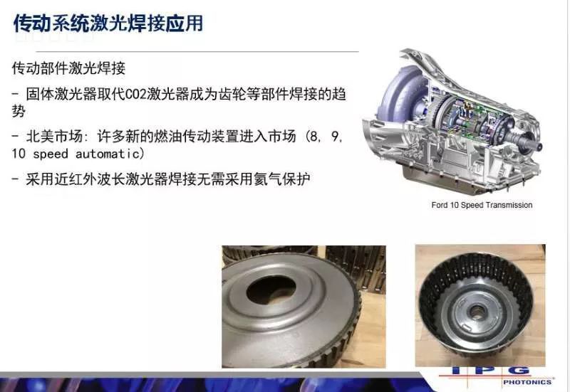過去的零部件很多都是用二氧化碳激光做的,現(xiàn)在固體的激光器去取代二氧化碳,這是零部件焊接的一個(gè)趨勢(shì),特別是對(duì)于北美市場(chǎng)很多新的燃油傳動(dòng)裝置開始慢慢進(jìn)入市場(chǎng),他會(huì)考慮用一些新的更經(jīng)濟(jì)更可靠的方法去體取代原有的設(shè)備。這里面IPG就通過大量的驗(yàn)證最終得出他們采用光纖激光器去取代二氧化碳不但可以得到非常可靠的焊接質(zhì)量,而且取消了氦氣保護(hù)的步驟,極大的節(jié)省了成本。