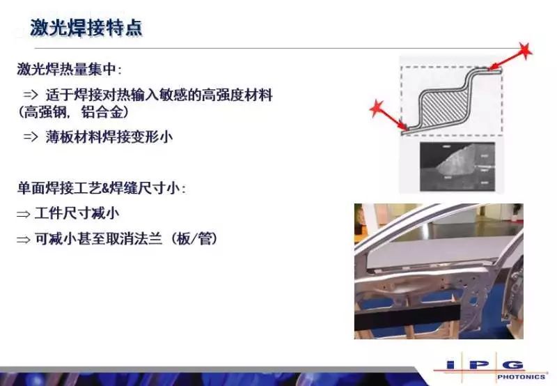 這是IPG做的一個(gè)領(lǐng)域車門的激光焊接,其實(shí)它的優(yōu)勢(shì)是蠻明顯的,他的熱量很集中,所以可以用小的熱輸入進(jìn)行焊接。