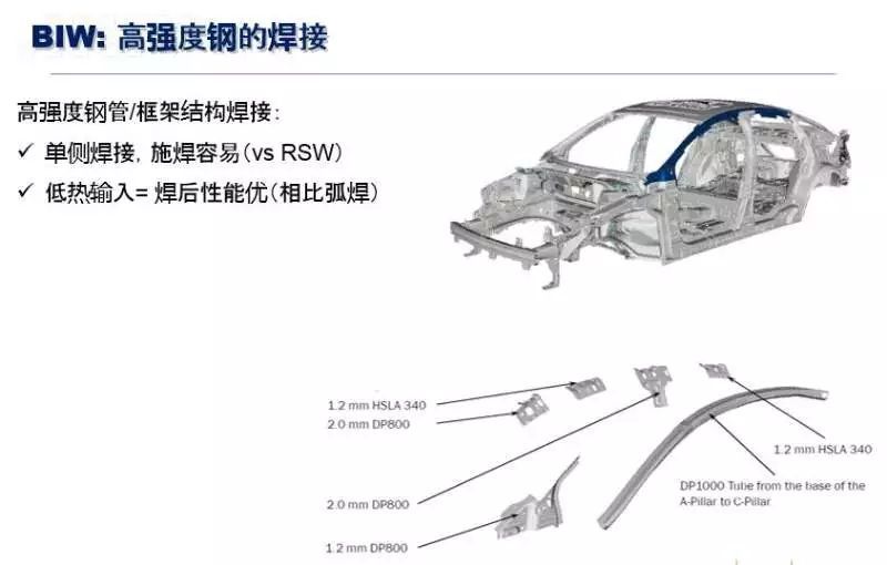 這也是高強(qiáng)度鋼,這里的DP800和DP1000,是鐵素體加馬氏體的一個(gè)雙相鋼,甚至還用到了熱成型鋼,是車體的一個(gè)側(cè)圍,主要是用34道遠(yuǎn)程激光焊接來實(shí)現(xiàn),用激光焊做高強(qiáng)鋼的焊接能使它的性能得到很好的保證。