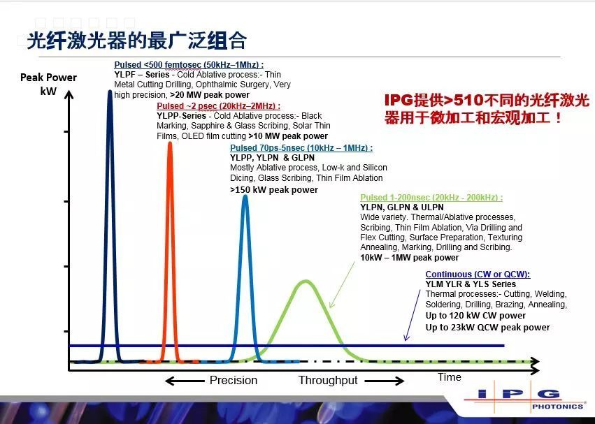以上是IPG產(chǎn)品線的圖譜,目前的產(chǎn)品線有飛秒、皮秒、納秒,綠光、紫外,還有主打在汽車領(lǐng)域的qcw、cw連續(xù)的激光器。在整個(gè)產(chǎn)品線上可以提供大于510種不同的光纖激光器,這510種不同的光纖激光器可以用于不同的未加工和宏觀加工的需求,客戶可以按照自己的需求進(jìn)行進(jìn)行采購(gòu)。