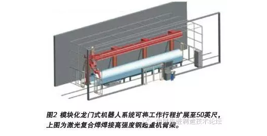激光復合焊的靈活度和焊接質量關鍵在于使用適合的機器人,同時配置相應的激光工具頭和焊槍系統。要求較高的路徑精度和重復定位精度,因此徠斯高強度的龍門式機器人系統非常適用。龍門式機器人擁有較大的工作范圍,可加工大型工件,同時節省地面空間(見圖2)。龍門式機器人配置成為機器人三維運動最大的柔性可能。