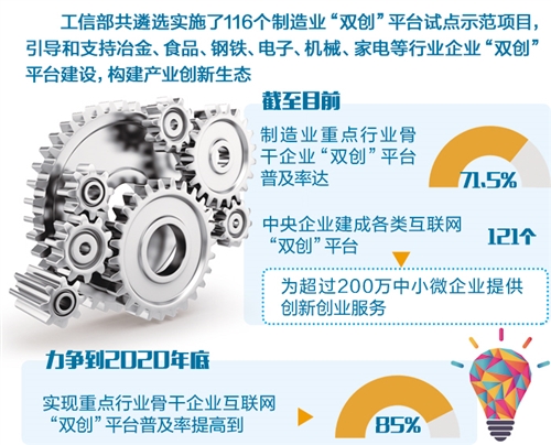 王新哲透露說,要繼續(xù)實(shí)施制造業(yè)“雙創(chuàng)”平臺(tái)建設(shè)專項(xiàng),依托產(chǎn)業(yè)聚集區(qū),打造一批行業(yè)特色鮮明、創(chuàng)業(yè)增長(zhǎng)較快、創(chuàng)新較為活躍、品牌影響力強(qiáng)、帶動(dòng)作用顯著的制造業(yè)“雙創(chuàng)”示范區(qū),推動(dòng)部省共建“雙創(chuàng)”示范基地。力爭(zhēng)到2020年底,實(shí)現(xiàn)重點(diǎn)行業(yè)骨干企業(yè)互聯(lián)網(wǎng)“雙創(chuàng)”平臺(tái)普及率提高到85%。