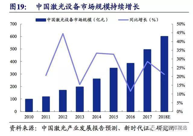 根據2018年3月發布的2018年中國激光產業發展報告,預計2018年中國激光設備市場規模將超過600億元、同比增長超過20%。