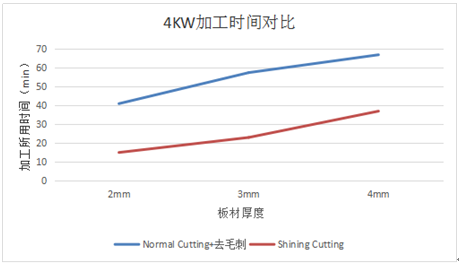 如:4KW激光器安裝“亮切模塊Shining Cutting Device”前后加工同一批鋁板單張板材(3000*1500)所用時間對比: