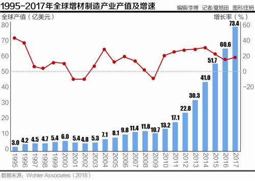 2017年,全球增材制造(即3D打印)產(chǎn)業(yè)產(chǎn)值73.36億美元,同比增長(zhǎng)21.0%,增速較去年提高了3.6個(gè)百分點(diǎn)。