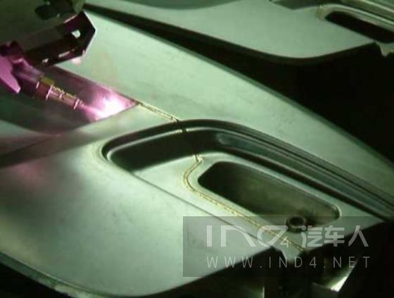 下圖為正在對后蓋上下外板進行激光釬焊工藝的過程。