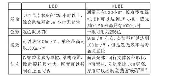 由于材料不同,構造不同,加工工藝也不同,所以有很多差異,下面列出了LED與OLED的一些比較特點: