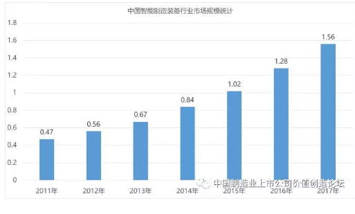 機械裝備的智能化是一個工業發達國家的重要標志,包含先進的制造技術以及先進的核心技術,是先進制造技術、信息技術和智能技術在裝備產品上的集成和融合。是國家產業發展的原始動力。近年來,我國智能制造裝備行業增長勢頭迅猛,初步形成一定的規模。2009年,智能制造裝備行業銷售產值約為3600億元,2015年智能制造裝備產業銷售收入超過1萬億元。從2013年開始,中國逐步成為世界最大的機器人市場,未來需求將保持快速增長。隨著制造業智能化的升級改造,我國智能制造裝備產業呈現較快的增長,2017年市場規模突破1.5萬億。