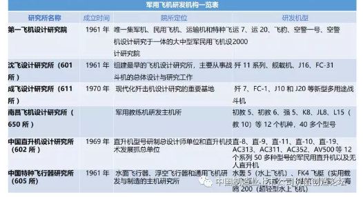 了若干總體研究所和關鍵技術研究所,對軍用飛機進行重點研發。其中601所、611所、650所和602所等主要研發飛機整機,如殲10、殲20等戰斗機及教練機、直升機等。