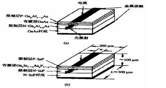 這種結構由三層不同類型半導體材料構成,不同材料發射不同的光波長。圖中標出所用材料和近似尺寸。結構中間有一層厚0.1~0.3 μm的窄帶隙P型半導體,稱為有源層;兩側分別為寬帶隙的P型和N型半導體,稱為限制層。三層半導體置于基片(襯底)上,前后兩個晶體解理面作為反射鏡構成法布里 - 珀羅(FP)諧振腔。