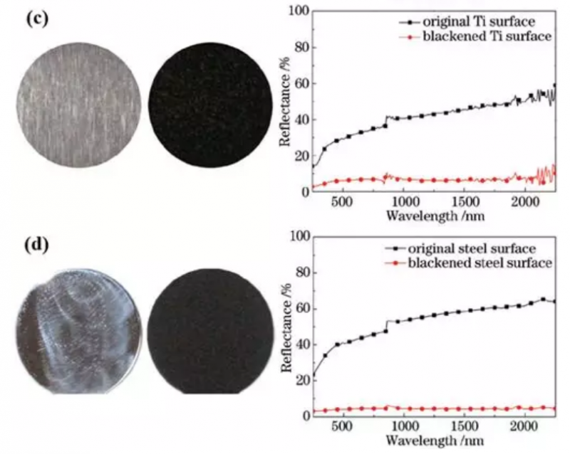 超快激光制備的黑色金屬及其在紫外-可見(jiàn)-近紅外波段的反射光譜(a)“黑”銅,(b)“黑”鋁,(c)“黑”鈦,(d)“黑”鋼