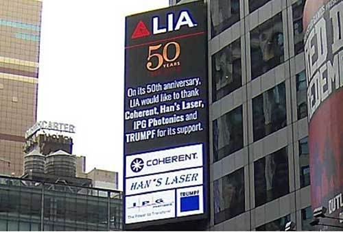 今年是學會成立的50周年,LIA在美國時代廣場舉世聞名的湯森路透大廈數字屏幕上播出:“在成立50周年之際,LIA特別感謝Coherent,大族激光(Han's Laser),IPG Photonics和TRUMPF的支持。”這是LIA對以上四家企業的感謝,也表達了對他們為行業作出巨大貢獻的認可,這也是中國企業亮相國際舞臺的高光時刻!