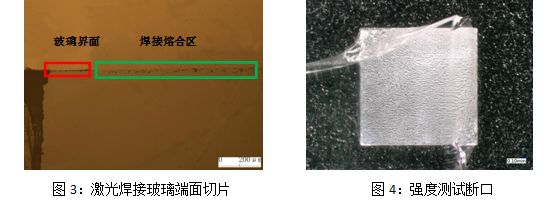 焊后玻璃端面切片圖顯示,采用新型激光焊接工藝進行焊接時,焊接融合區域并未呈現水滴狀,沒有出現頂部圓形空腔和底部線形結構微小空腔等焊接裂紋源缺陷,其中部熔融區域也未出現斷續未焊接成型的線形裂紋缺陷。進行焊接強度測試,材料在母材區域發生破裂,焊點未有脫落,焊縫具有較好的焊接強度。