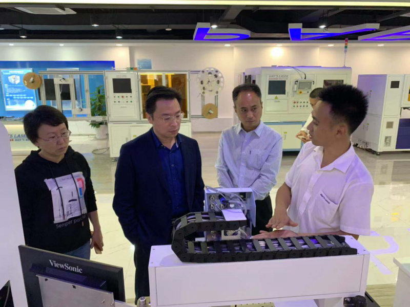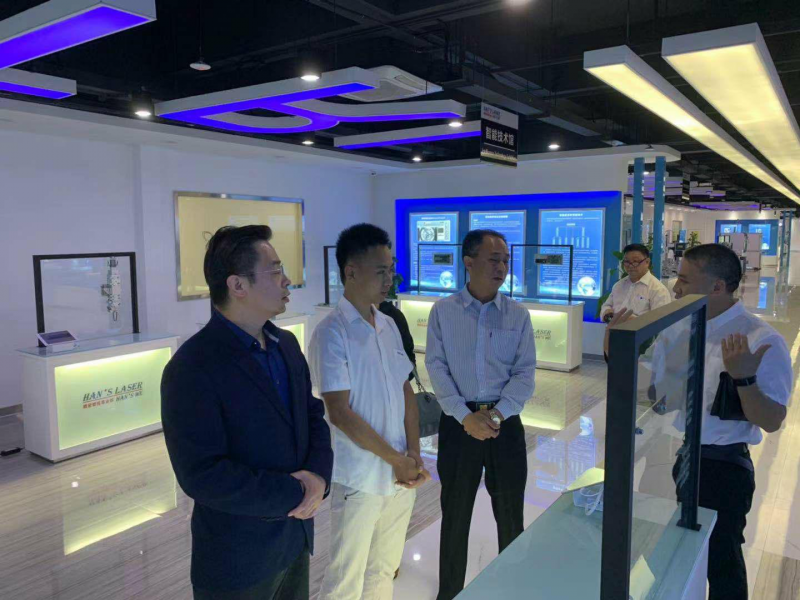 緊接著,考察團一行前往深圳市創鑫激光股份有限公司,在羅美玲經理的引領下,全面地參觀考察了展廳和車間生產窗口,成套的研發設備,標準的現代化車間,嚴格的生產管理都給參觀者留下了深刻的印象,特別是專一生產激光器的企業規模、激光技術、環保處理等使時部長一行感到非常震撼。