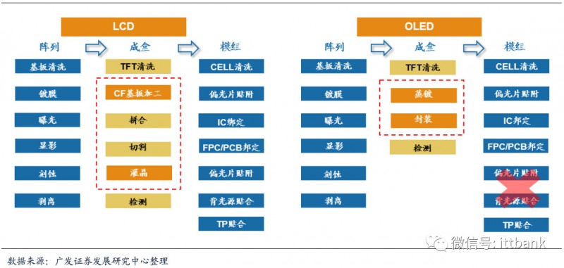 ▲LCD及OLED顯示面板工藝制程對比