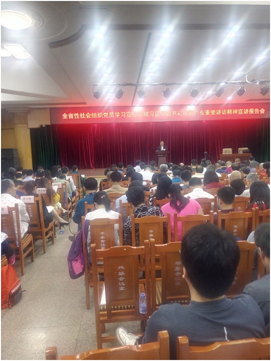 廣東省民政廳黨組成員巡視員、廣東省社會組織黨委書記王長勝到會并作重要話;廣東省委宣講團成員.華南師范大學馬克思主義學院院長陳金龍做宣講報告。陳院長從幾個方面認真闡述了習主席的講話與廣東經濟發展和改革開放的必然關系及重大歷史淵源。