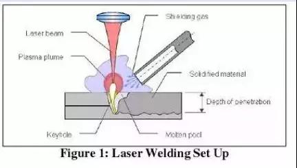 當(dāng)功率密度達到一定的范圍(106~107 W/cm2)的激光束照射到材料表面時,材料吸收光能轉(zhuǎn)化為熱能,材料被加熱熔化至汽化,產(chǎn)生大量的金屬蒸汽,在蒸汽逸出表面時產(chǎn)生的反作用力下,使熔化的金屬液體向四周排擠,形成凹坑,隨著激光的繼續(xù)照射,凹坑穿入更深,當(dāng)激光停止照射后,凹坑周邊的熔液回流,冷卻凝固后將兩工件焊接在一起。