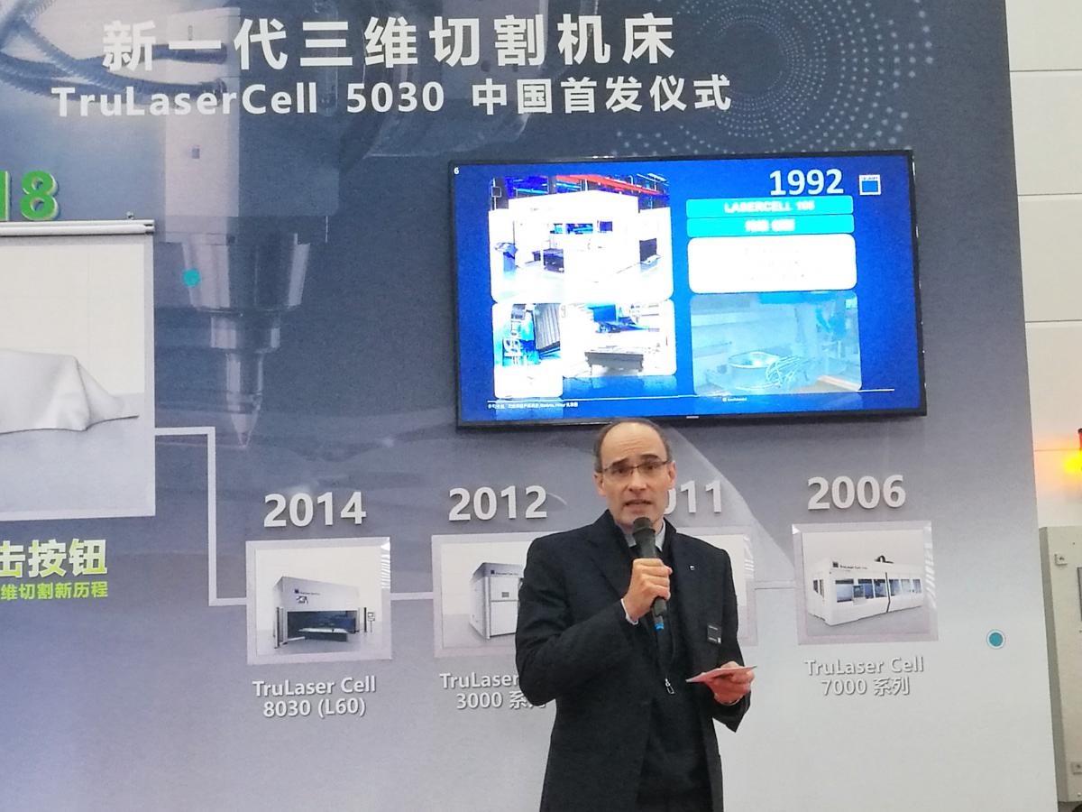 在揭幕儀式上,通快(中國)有限公司激光技術部總經理Volker Kuehnle先生以流利的中文回顧了通快三維激光系統發展的12年歷程——2006年首推TruLaser Cell 7000系列,2011年推出TruLaser Cell 8030(L45),2012年推出TruLaser Cell 3000系列,2014年推出TruLaser Cell 8030(L60),直到今天正式中國市場推出TruLaser Cell 5030。
