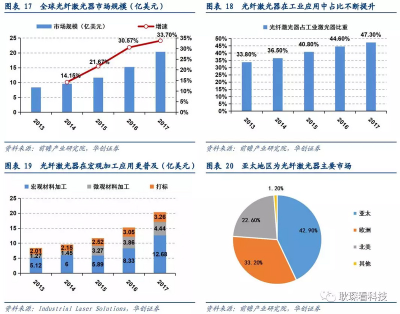 全球光纖激光器市場(chǎng)增長(zhǎng)較快,工業(yè)應(yīng)用占比顯著提高。根據(jù)前瞻產(chǎn)業(yè)研究院數(shù)據(jù),全球光纖激光器市場(chǎng)規(guī)模從2013年的8.41億美元增長(zhǎng)到2017年的20.39億美元,年復(fù)合增長(zhǎng)率達(dá)24.78%。其占工業(yè)激光器市場(chǎng)比重近年來(lái)也接近50%,對(duì)部分其他類(lèi)型激光器的替代也逐步顯現(xiàn)。其中,亞太地區(qū)為光纖激光器的主要市場(chǎng)。