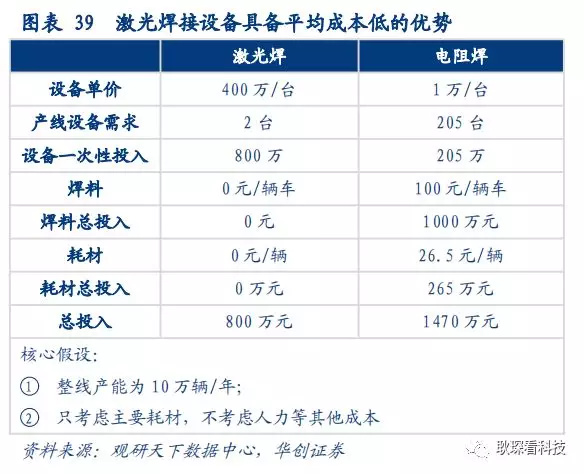 “輕量化”:要求新能源汽車(chē)嘗試與傳統(tǒng)造車(chē)工藝不同的新材料,例如鋁、鎂、鈦等合金,炭纖維、復(fù)合材料等輕質(zhì)材料;同時(shí)要盡量減少焊接點(diǎn)帶來(lái)的重量增加。與傳統(tǒng)電阻焊相比,激光焊接不僅能壓縮車(chē)身結(jié)構(gòu)件本身的體積,減少車(chē)身重量,降低汽車(chē)油耗,而且可以提升車(chē)身強(qiáng)度,減少工序和生產(chǎn)材料損失,提高生產(chǎn)效率。激光在切割新材料時(shí),效率更快、精度更高、且適應(yīng)性強(qiáng),容易實(shí)現(xiàn)。