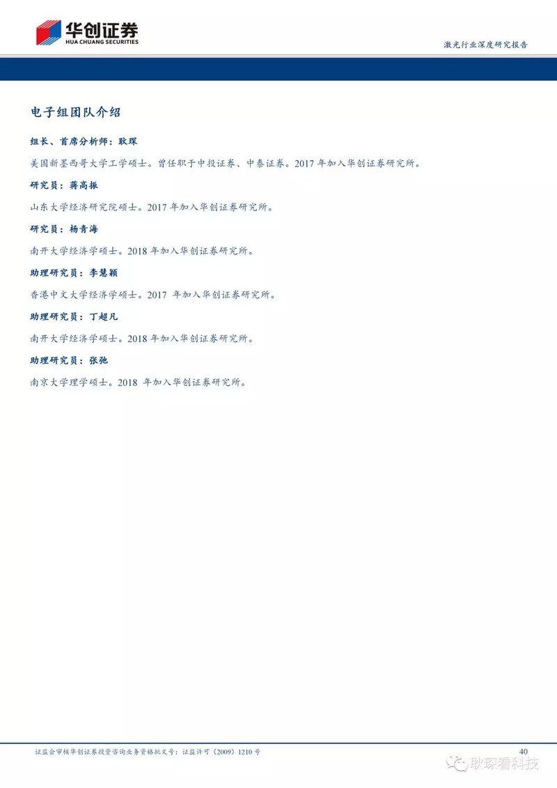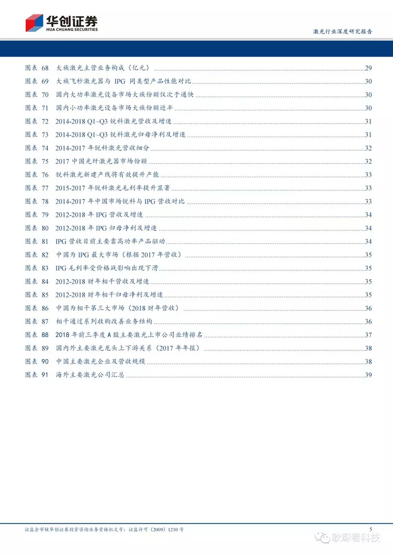 中短期經(jīng)濟(jì)波動(dòng)致使下游資本開(kāi)支收縮,技術(shù)本質(zhì)確保長(zhǎng)期向上內(nèi)在驅(qū)動(dòng)力。回顧09年至今全球激光產(chǎn)業(yè)龍頭近10年季度數(shù)據(jù),產(chǎn)業(yè)規(guī)模整體呈周期性波動(dòng)向上趨勢(shì),以IPG、相干、大族、華工為代表的海內(nèi)外龍頭公司季度營(yíng)收穩(wěn)步上行;另一方面,季度同比數(shù)據(jù)顯示全球激光產(chǎn)業(yè)規(guī)模歷經(jīng)09H2-10H1、17H1-18H1兩次較大幅度提升后(切割市場(chǎng)滲透、宏觀加工及消費(fèi)電子創(chuàng)新需求向好),目前受工業(yè)制造宏觀周期、終端產(chǎn)品創(chuàng)新周期、中美 貿(mào)易戰(zhàn)等多因素疊加影響,當(dāng)前產(chǎn)業(yè)處于相對(duì)低迷階段。但我們應(yīng)注意到,國(guó)內(nèi)龍頭設(shè)備廠商依托客戶(hù)拓展及產(chǎn)品升級(jí),不斷進(jìn)駐新應(yīng)用領(lǐng)域(LED、PCB、EV、OLED、半導(dǎo)體)等,在全球激光產(chǎn)業(yè)大周期背景下,有望重復(fù)自身成長(zhǎng)小周期;以銳科為代表的國(guó)產(chǎn)激光器廠商于18年開(kāi)始逐步突破3300W及6000W等中高功率市場(chǎng),雖遭遇海外龍頭價(jià)格競(jìng)爭(zhēng)策略,但規(guī)模化量產(chǎn)與原材料自制比例提升,有望同步降低成本價(jià)格,提升下游滲透速度。國(guó)內(nèi)從激光晶體、激光器到激光及配套自動(dòng)化設(shè)備短期產(chǎn)業(yè)波動(dòng),中長(zhǎng)期向上發(fā)展趨勢(shì)不變。
