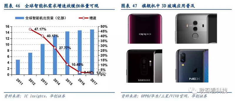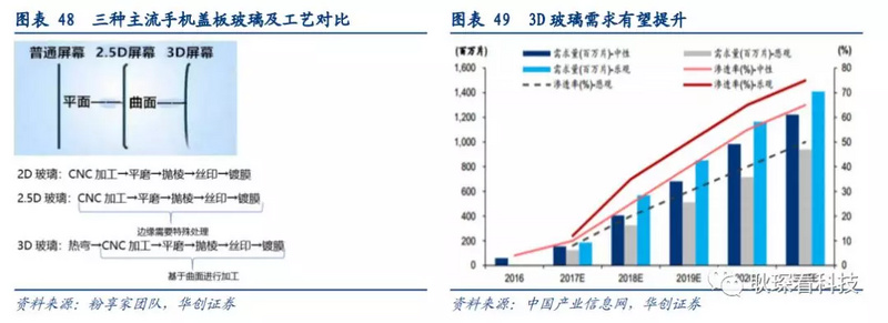 1. 3D玻璃需求升溫:為提升占屏比、獲得更好的視覺(jué)效果和握持手感,3D玻璃在許多廠商產(chǎn)品的正面及背面蓋板均有使用。激光工藝主要應(yīng)用于3D玻璃的外形切割與表面掃光兩個(gè)核心工序,是目前業(yè)內(nèi)主流加工方式。據(jù)中國(guó)產(chǎn)業(yè)信息網(wǎng)預(yù)計(jì),3D玻璃蓋板需求將由2017年的1.24-1.86億片,增加至2021年的9.4-14.1億片,5年總需求量約為26.2-41.8億片。