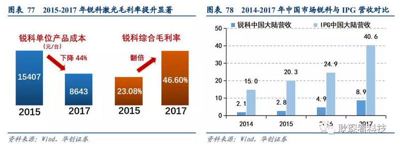 整合上游產(chǎn)業(yè)鏈,加大元器件自制比例:降低成本,把控品質(zhì),提升競(jìng)爭(zhēng)力。目前銳科已掌握光纖激光器及其核心器件和材料的關(guān)鍵技術(shù),并實(shí)現(xiàn)了光纖激光器上游產(chǎn)業(yè)鏈的垂直整合,例如:半導(dǎo)體泵浦源、特種光纖、光纖耦合器、激光功率合束器、聲光調(diào)制器、光纖隔離器、激光功率傳輸光纜組件等核心器件和材料的技術(shù)及規(guī)模化生產(chǎn)。以泵浦源為例,占光纖激光器成本60-70%,自制后成本占比下降至20-30%。2017年3月,銳科收購(gòu)特種光纖生產(chǎn)商睿芯光纖,主要用于連續(xù)光纖激光器生產(chǎn),進(jìn)一步降低了直接材料成本。