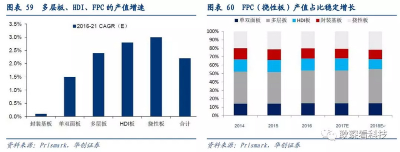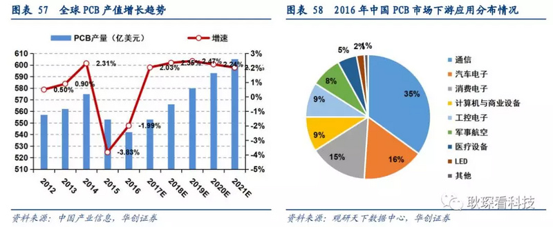 受益于國(guó)外PCB產(chǎn)業(yè)向國(guó)內(nèi)轉(zhuǎn)移,下游通信、汽車(chē)、消費(fèi)電子等產(chǎn)業(yè)的需求猛增,多層板、HDI和FPC的增長(zhǎng)速度均領(lǐng)先行業(yè)整體。近年全球PCB行業(yè)產(chǎn)值增長(zhǎng)回暖,2016年全球PCB總產(chǎn)值約542億美元。據(jù)Prismark 2017年底預(yù)測(cè),2017年全球PCB產(chǎn)值增長(zhǎng)率將超過(guò)2%,達(dá)到553億美元;FPC產(chǎn)值規(guī)模有望在2017年達(dá)到113.46億美元。近年來(lái)整體規(guī)模增長(zhǎng)穩(wěn)定,汽車(chē)、工控醫(yī)療等下游仍有較快增速。到2021年,全球PCB行業(yè)產(chǎn)值有望達(dá)到605億美元。