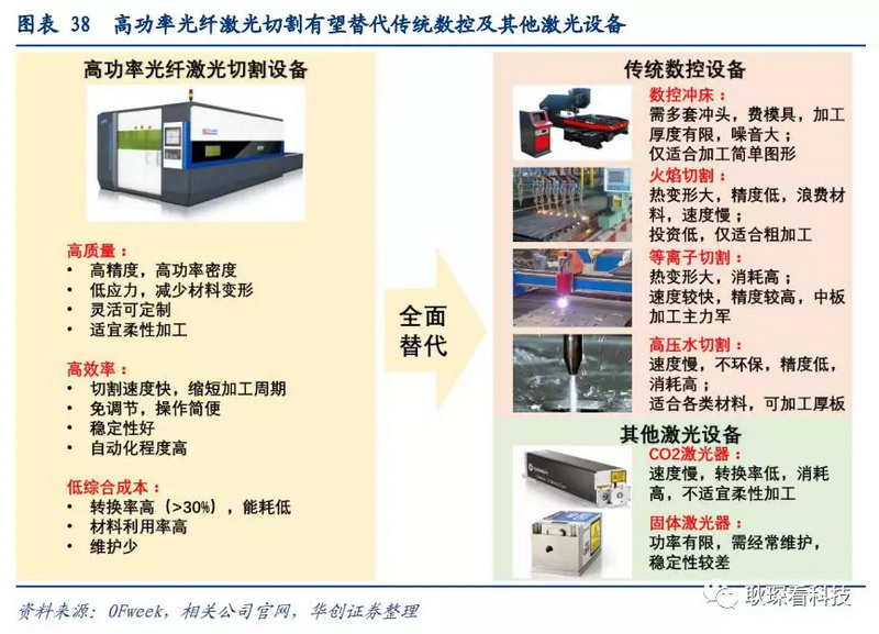 高功率激光切割設(shè)備主要替代傳統(tǒng)數(shù)控設(shè)備。激光切割機(jī)是由激光器發(fā)出的激光束經(jīng)透鏡聚集形成極小的光斑(功率密度高達(dá)10^6-10^9W/cm^2),焦點(diǎn)處工件被高溫瞬間汽化,再配合輔助氣體將汽化的金屬吹走,從而切穿成一個(gè)小孔。隨著機(jī)床移動(dòng),無(wú)數(shù)個(gè)小孔銜接起來(lái)構(gòu)成要切的外形。由于激光切開(kāi)頻率十分高,所以每個(gè)小孔銜接處十分光滑。激光切割具備高速高精密、可重復(fù)性、異形切割、產(chǎn)能大、材料適應(yīng)性強(qiáng)等優(yōu)勢(shì)。據(jù)觀研天下數(shù)據(jù),目前傳統(tǒng)沖床市場(chǎng)規(guī)模在200-300億元,激光設(shè)備仍有巨大替代空間。